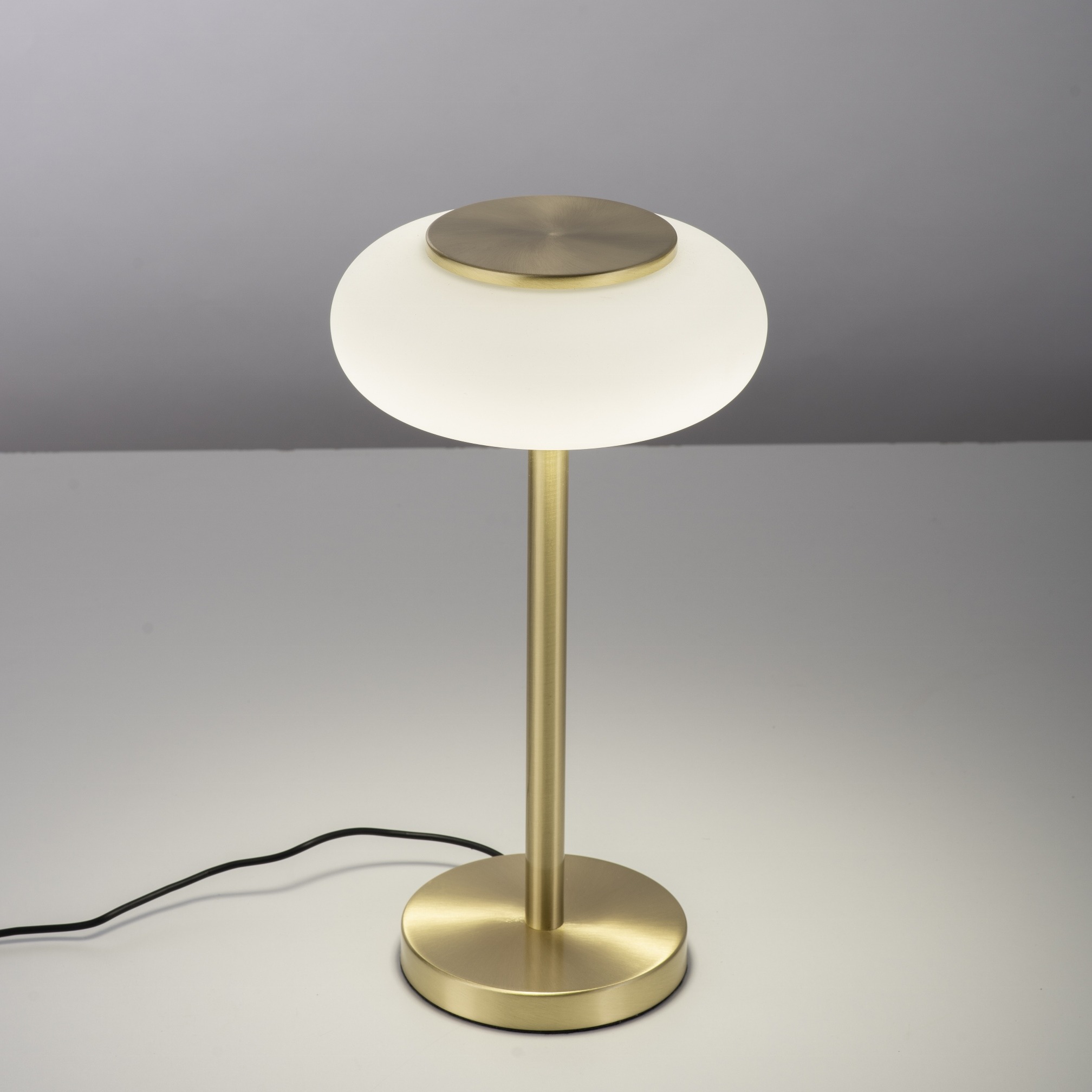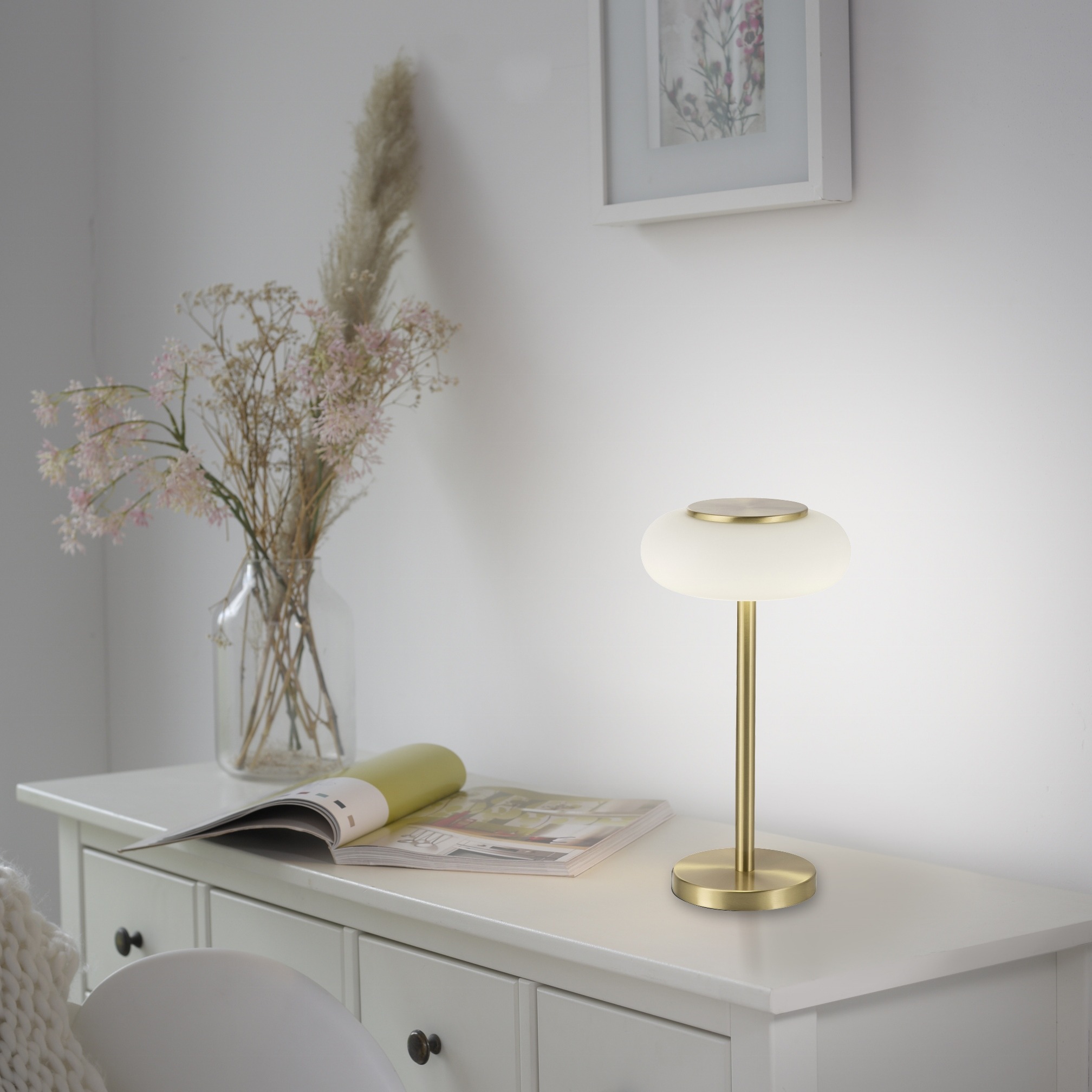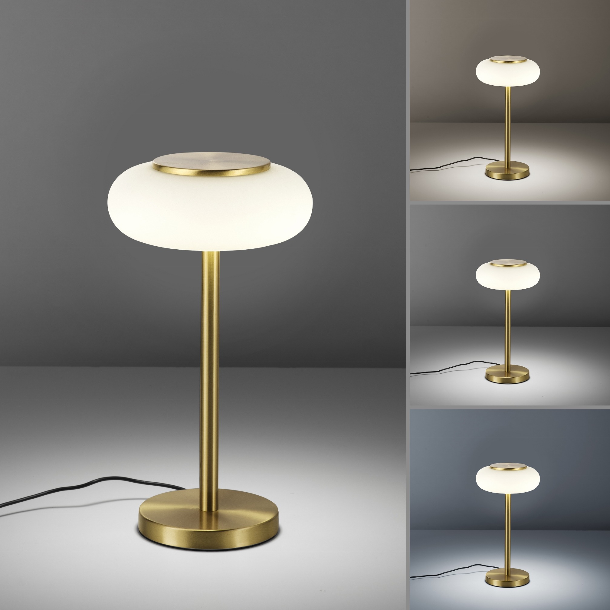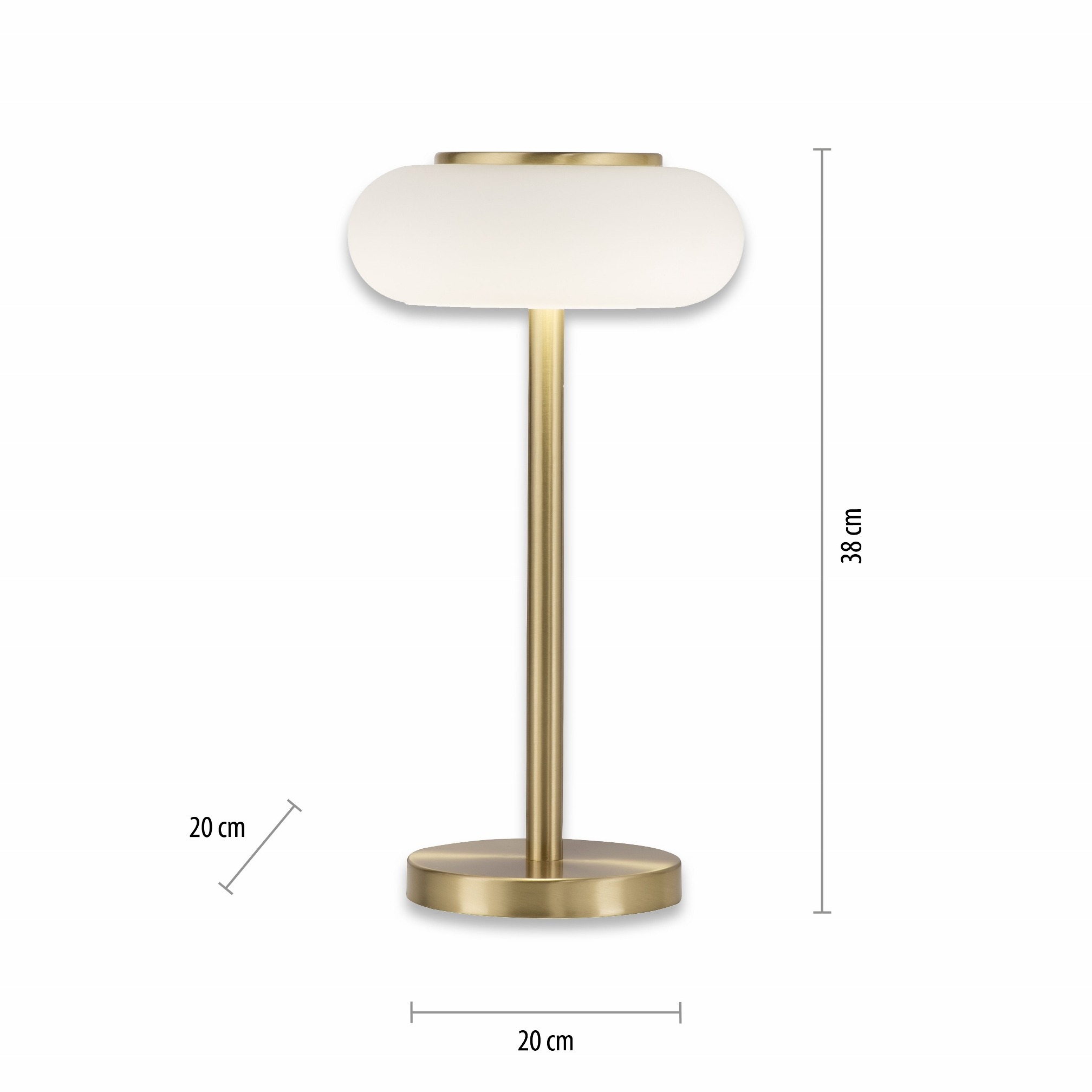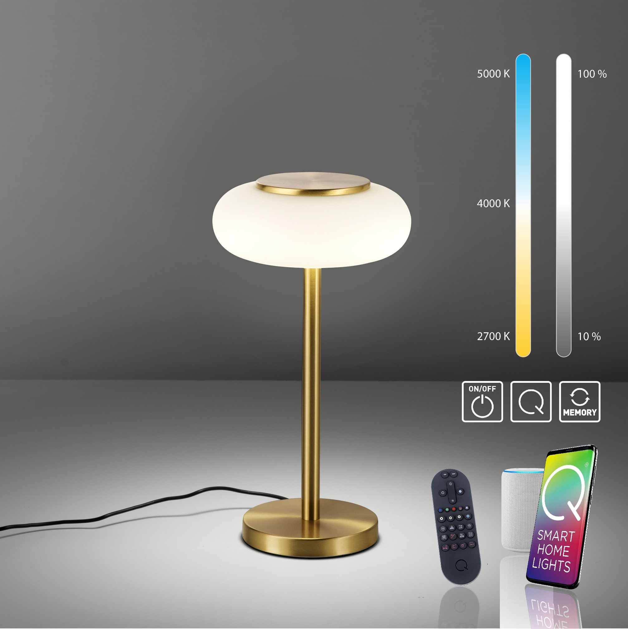 Den runda LED-bordlampan Q®-ETIENNE övertygar med sin moderna men tidlösa design. Den bulliga lampskärmen av glas sitter på en armaturram i matt mässing och avger ljuset bländfritt till omgivningen. Dessutom är den lilla tilläggslampan utrustad med en strömbrytare som kan användas för att tända och släcka armaturen. Q®-ETIENNE-armaturen är utrustad med en CCT-ljusstyrning och kan kontinuerligt ändras från varmvitt (2700K) till dagsljusvitt (5000K) eller dämpas från ljust till mörkt via fjärrkontrollen. Tack vare minnesfunktionen behålls den senast valda inställningen tills en ny inställning görs.