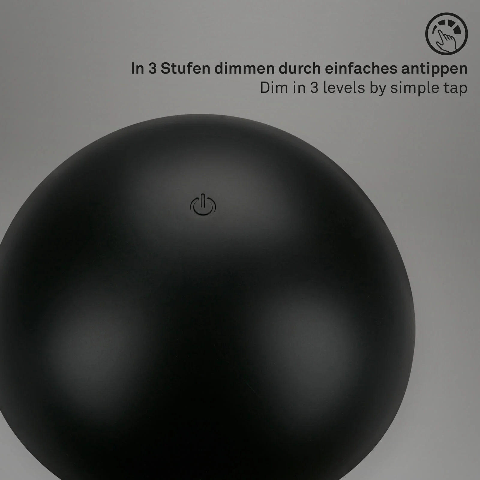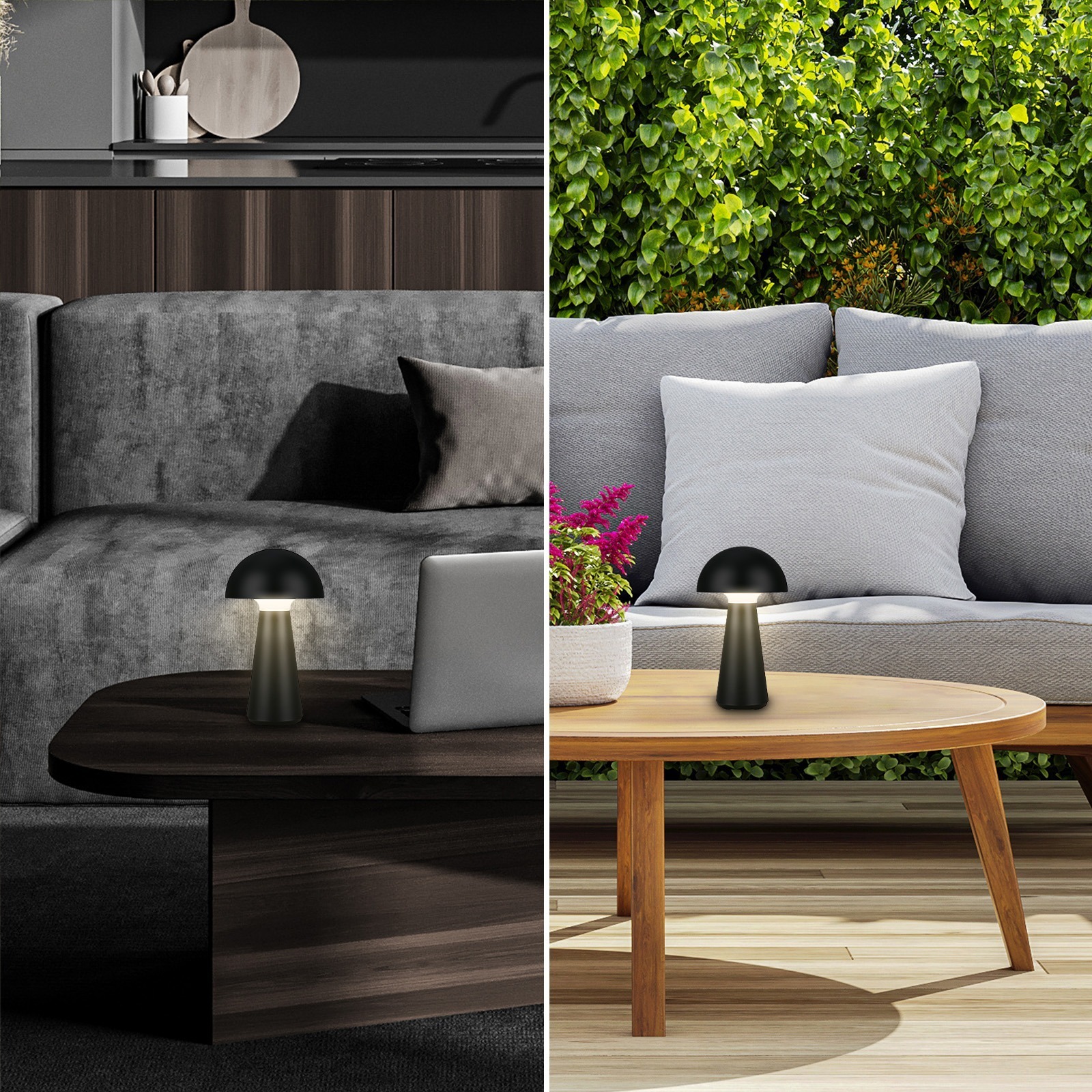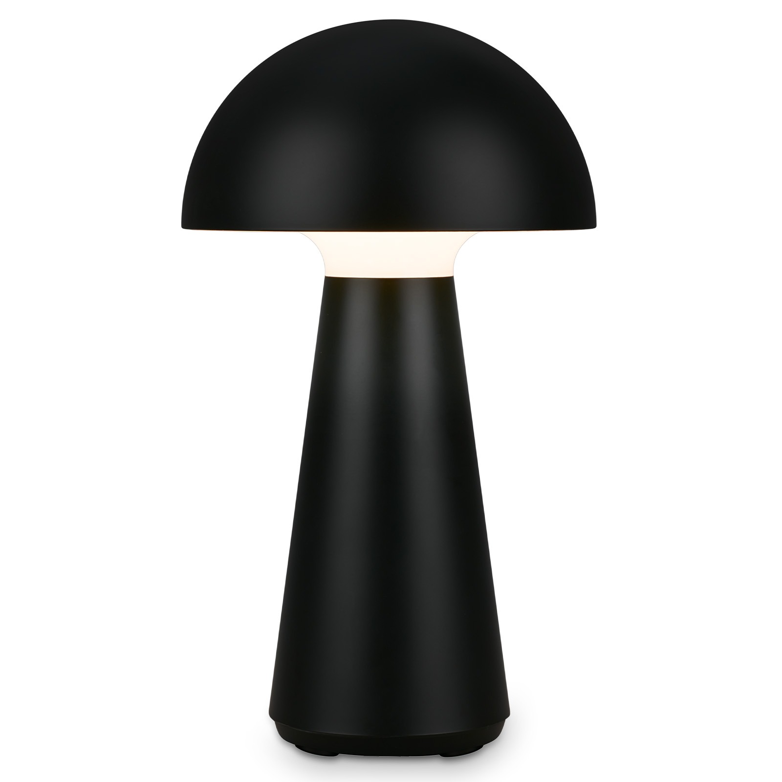 Eftersom bordslampan är batteridriven kan du använda den som en bärbar lampa var som helst i huset. I hallen, sovrummet, kontoret, arbetsrummet, matbordet, vardagsrummet, barnrummet och som dekoration på köksbordet, matbordet, skåpet och hyllan. Ljuskällan skapar ett vackert downlight i kombination med den svampformade lampskärmen. LED-batteribordslampan kan användas som sovrumslampa, skrivbordslampa, läslampa eller dekorativ lampa. Den kan dimmas i tre steg genom beröring. Det varmvita ljuset, med en temperatur på 3000 Kelvin, är en vacker accent för romantiska och mysiga kvällar vid en grillfest med vänner eller en middag för två. Den trådlösa bordslampan med batteri är skyddad mot stänkvatten genom skyddsklass IP44, om den skulle bli blöt vid camping, utomhus, på terrassen eller balkongen. Den medföljande, moderna USB-C-kabeln används för att ladda LED-lampan. Det inbyggda uppladdningsbara batteriet har en drifttid på upp till 18 timmar när det är fulladdat och ljusstyrkan justeras försiktigt. Den sladdlösa lampan har filtglidare på lampans undersida som skyddar mot repor på känsliga ytor. Batterilampan mäter 280×160 mm (HxD). Färgen är matt svart.
