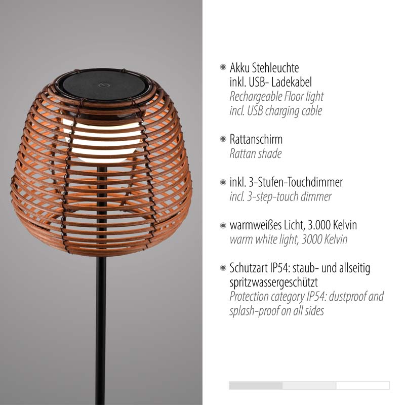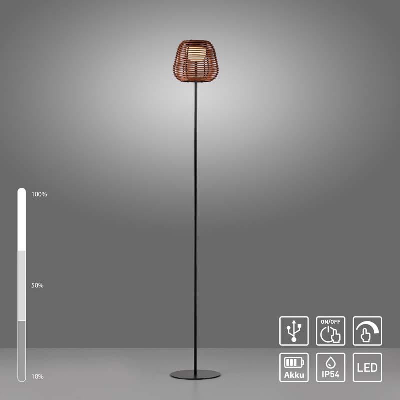 Fördjupa dina vardagsrum eller utomhusområden i naturligt och atmosfäriskt ljus med ASKIA LED batteridrivna golvlampa. Dess eleganta svarta utseende kombinerat med den charmiga rottinglampskärmen skapar ett vackert ljusspel. Med sin varmvita färgtemperatu