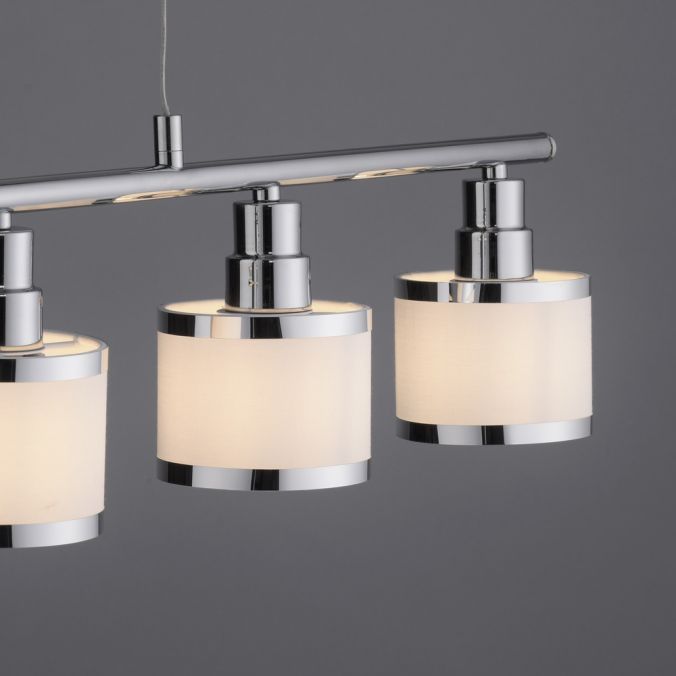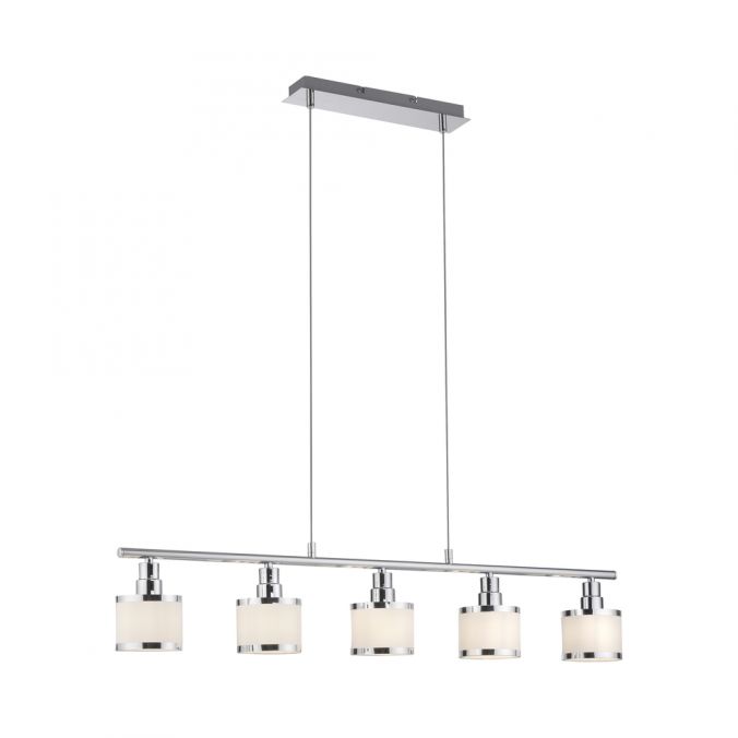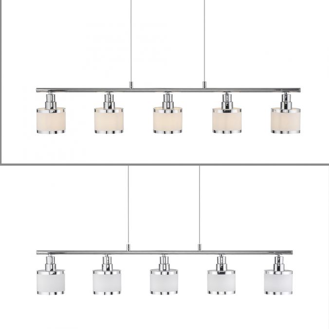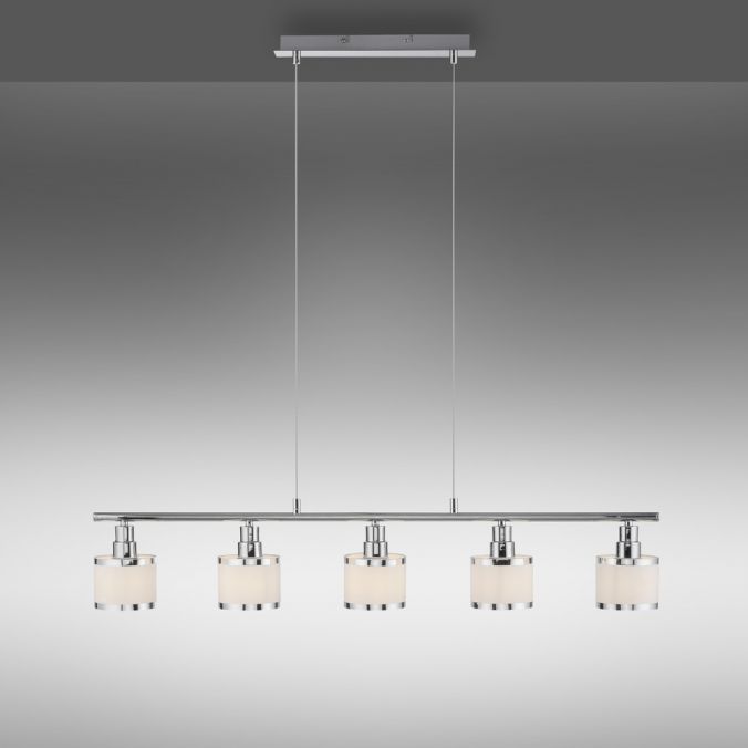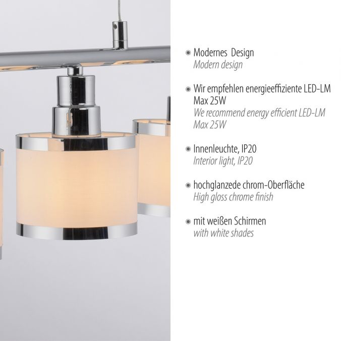 Pendellampan är skickligt iscensatt med en glänsande kromyta och de fem lampskärmarna. Glödlamporna ingår inte i leveransomfattningen. ACCOR kan förses med fem E14-lampor på vardera max. 25 watt. Användningen av LED-ljuskällor är idealisk. Pendellampan kommer garanterat att snabbt hitta en lämplig plats ovanför matbordet och sätta maten i perfekt ljus.