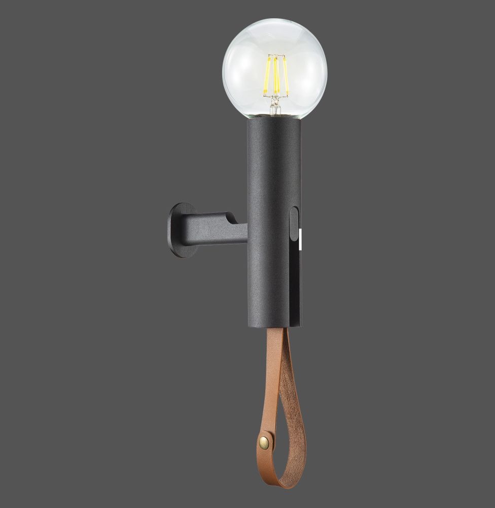Ovanlig vägglampa med minimalistisk design. Kombinationen av metall och läder skapar en underbar stilmix. Du bestämmer själv vilken filament som passar bäst till just din inredning.