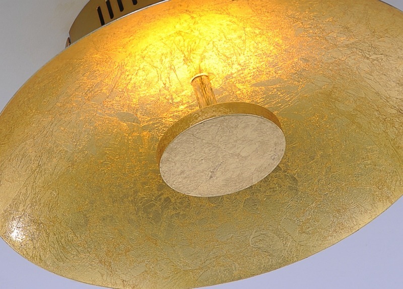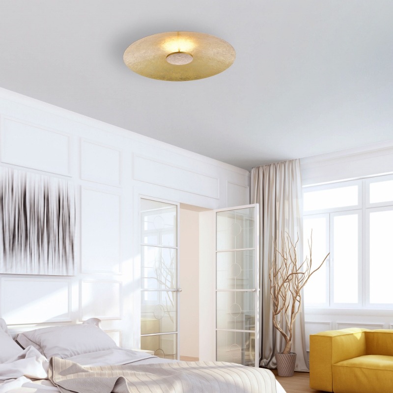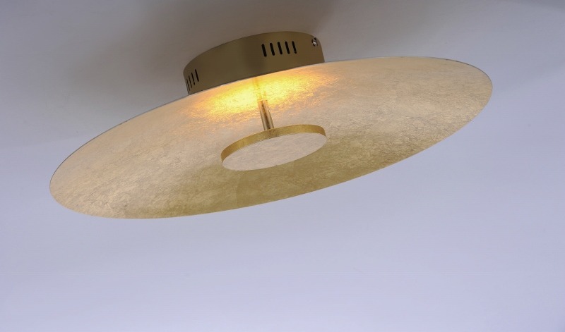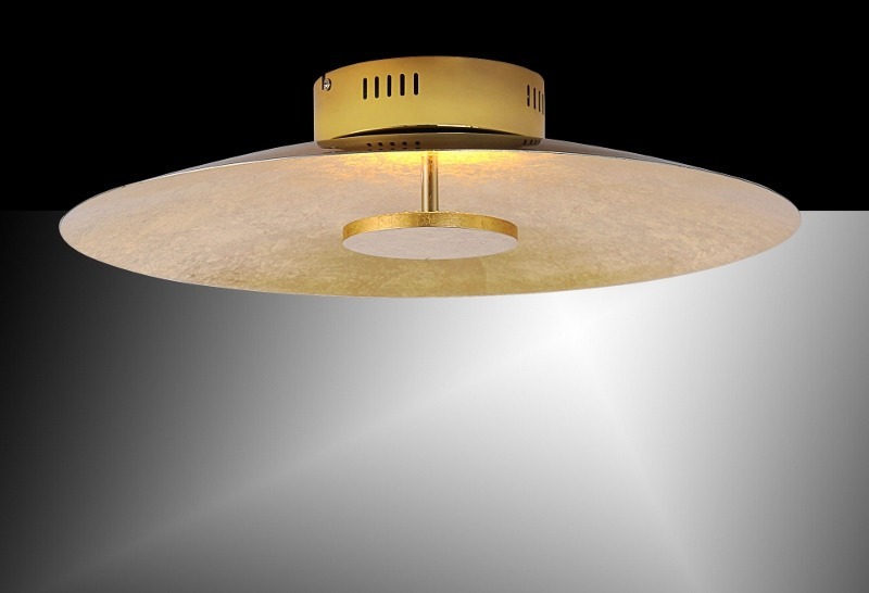 Taklampan PILATA övertygar med ett samspel av ljus och reflektion. Den runda armaturen är tillverkad av stål och ser särskilt elegant ut tack vare den bladguldfärgade lacken. Den levereras med en permanent installerad 25 Watt LED-lampa. Lampan avger cirka 2000 lumen och är behagligt varmvit med en färgtemperatur på 3000 Kelvin. Den indirekta belysningen och därmed den vackra reflektionen på den guldfärgade skålen ger ditt vardagsrum en dekorativ touch. Den har en diameter på 500 mm och en höjd på 100 mm. Taklampan är dimbar med en lämplig separat dimmer. Vi rekommenderar dimrar från leverantörerna GIRA 30700, BERKER 2874 eller JUNG 225 TDE.